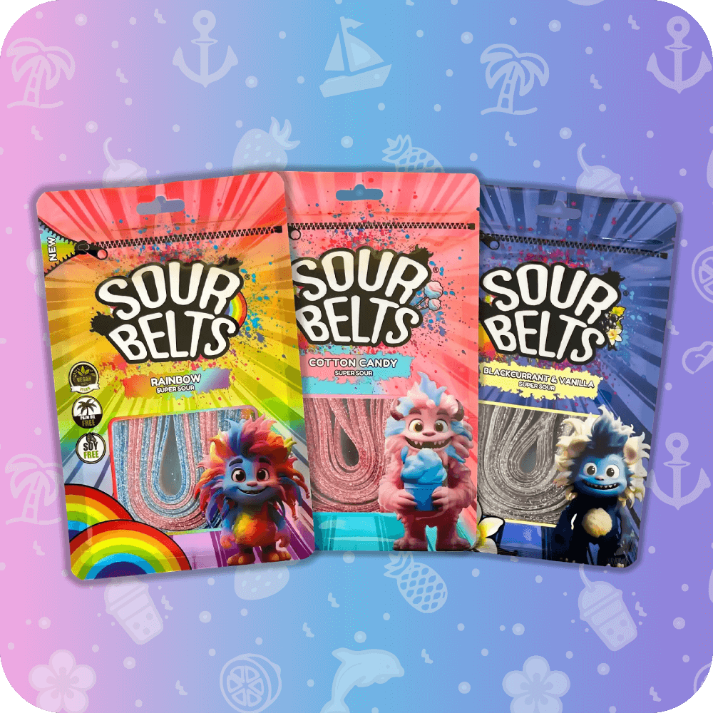 (Packung enthält drei SOUR BELTS Beutel) – je ein Beutel pro Geschmacksrichtung: RAINBOW, COTTON CANDY, BLACKCURRANT & VANILLA.